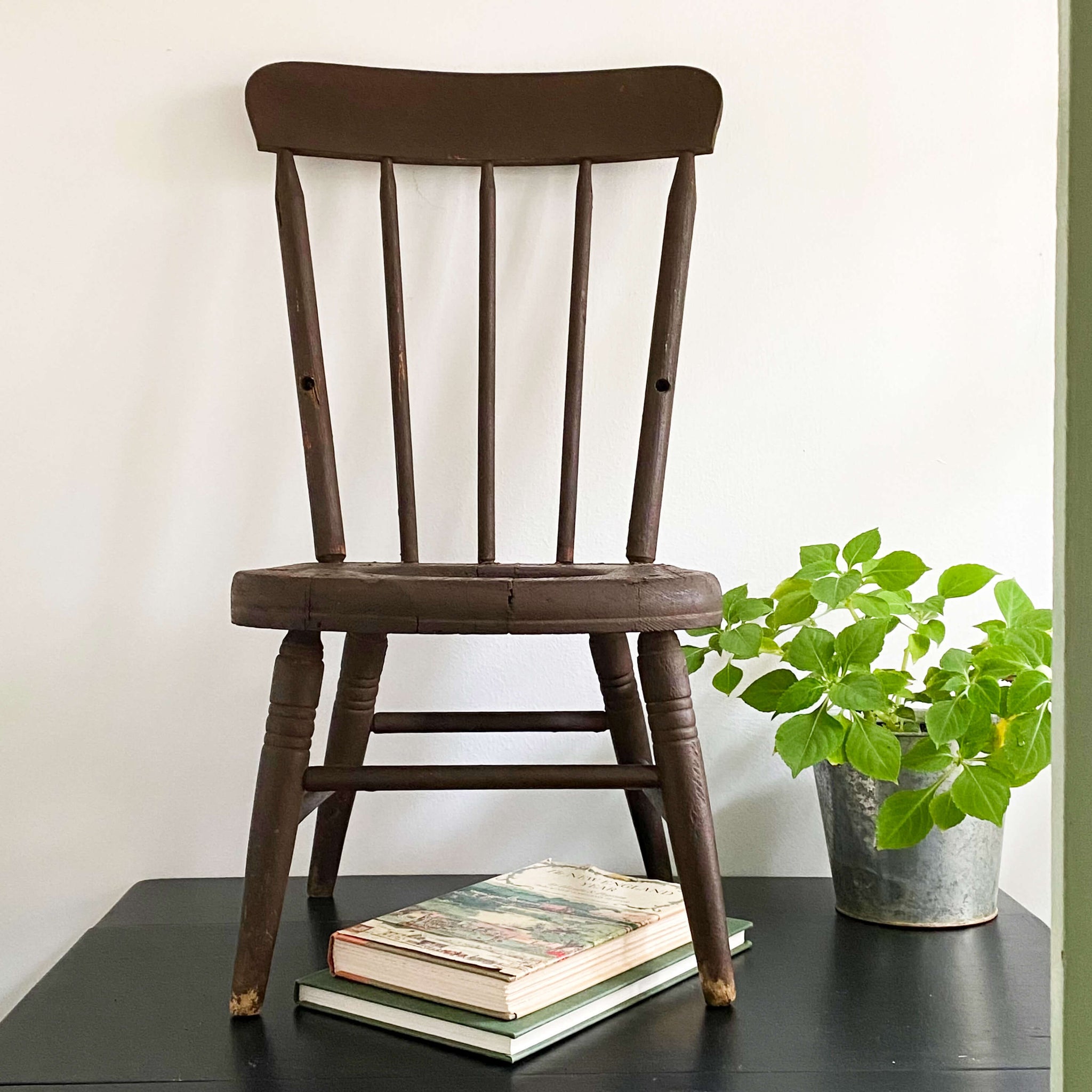 Built for the kiddos of the Victorian era, this antique Windsor-style chair is a miniature version of a full size dining chair and ‘made of hardwood with turned legs and a decorative floral relief on the top rail. .