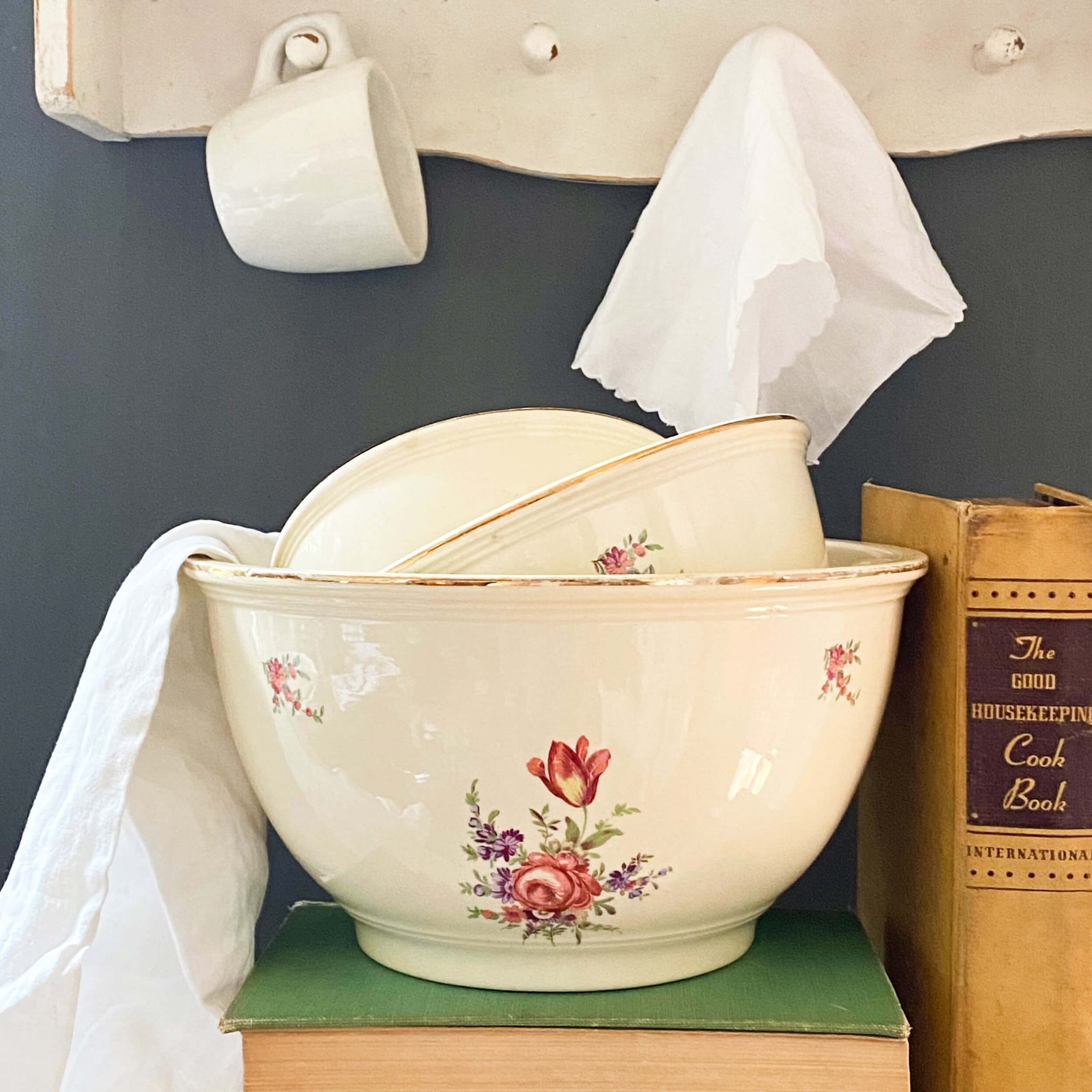 True kitchen characters, just like vintage cookbooks of the same era, WWII mixing bowls saw cooks through their most creative kitchen endeavors. War rationing of many pantry staples including sugar, meat, butter, cheese, canned foods and coffee made cooking and baking such a challenge as alternative ingredients were substituted to mimic flavor and fool the mind. There's no doubt that this pretty set was part of inventive meal-making of the most magical kind. It's so fun to imagine what sorts of inspirations these three helped create.